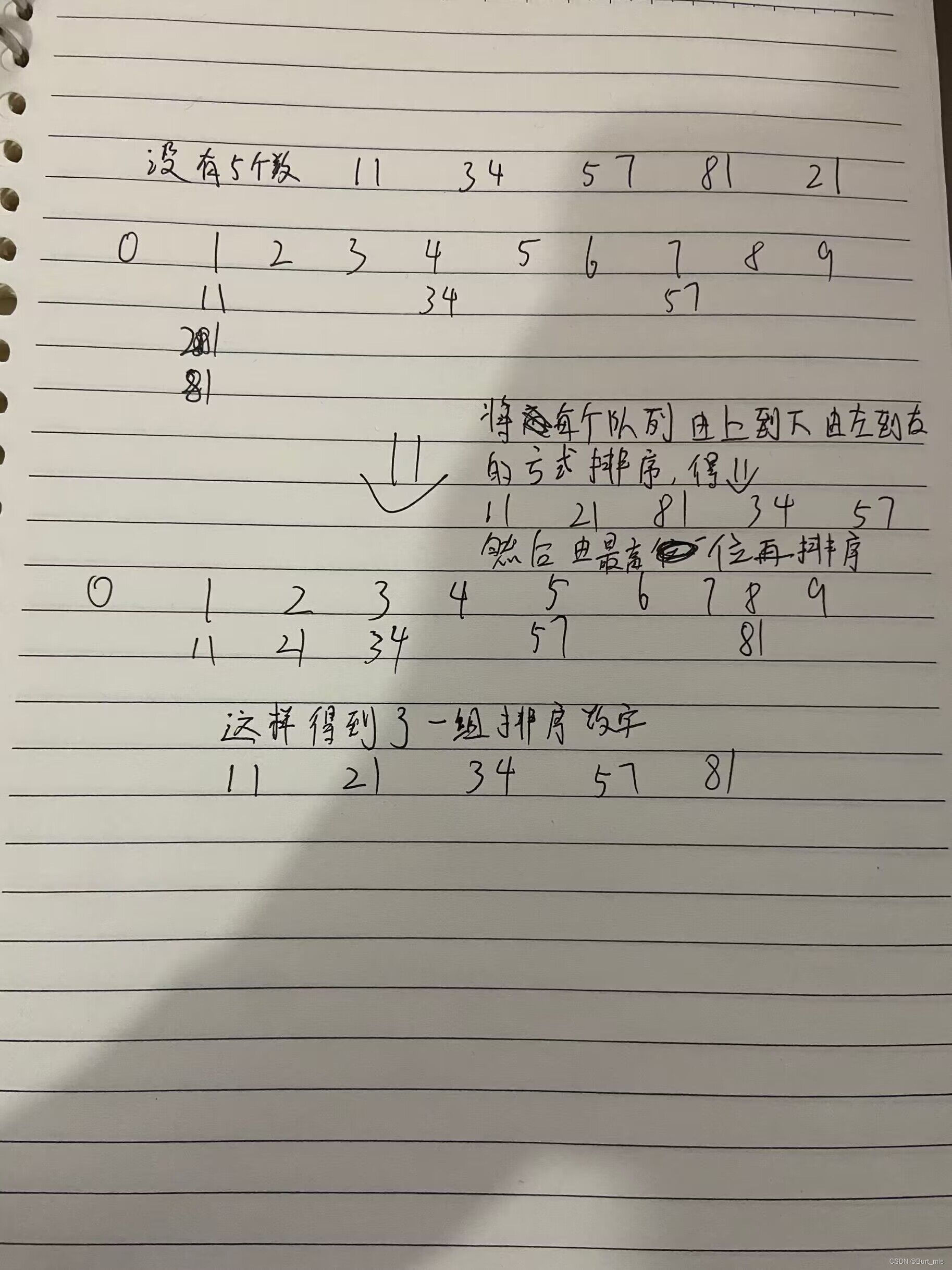 其中,0 1 2 3 4 5 6 7 8 9可以看作方便排序的一个队列。谈论到那五个数字,我们先将他们的最低有效位进行比对,11的最低有效位是1,所以放到1那一行,34最低有效位是4,所以放到4那行,57最低有效位是7,所以放到7那行,而81、21都是1所以都放到1那一行,然后通过从左到右,从上到下的排序方式进行排序,得到第一组数字就是11,21,81,34,57。然后,我们再通过对最高有效位进行比对,11放到1那一行,21放到2那一行,81放到8那一行,34放到3那一行,57放到5那一行。就得到最终的排序:11,21,34,57,81。当然如果要排序的数中有三位数或者更高位数,那就需要从最低一次一次的重复这样进行排序直到到最高有效位