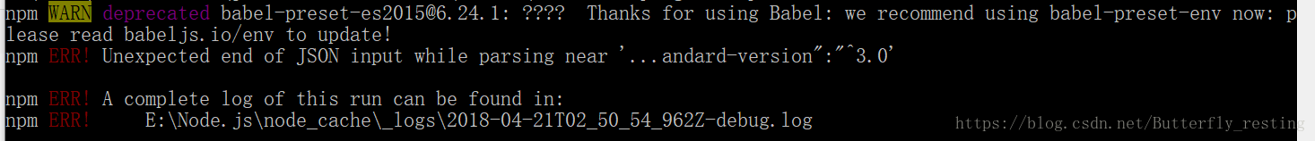 在npm install前端项目时报错error Unexpected end of JSON input while parsing near '...andard-version":"^3.0'
