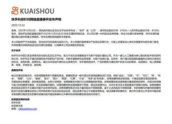 或受此事件影响,市值超2700亿港元的快手-W(HK01024)股价在12月23日盘中一度下跌超5%。据公告,经全力处置与系统修复,快手应用的直播功能已逐步恢复正常服务。快手应用的其他服务未受影响。