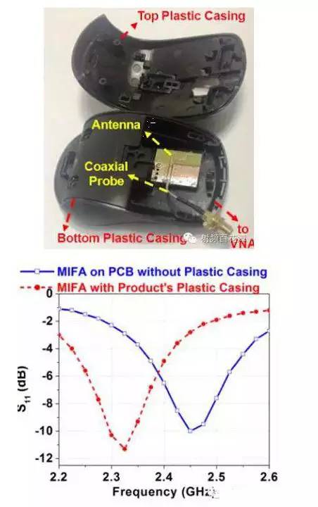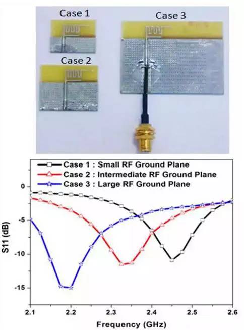 通常消费类产品中所使用的天线对PCB射频接地层的大小和产品的塑料外壳非常敏感。可将天线模拟为一个LC谐振器,当L(电感)或C(电容)增加时,该LC谐振器的谐振频率会下降。更大的射频接地层和塑料外壳会增大有效电容,从而降低谐振频率。