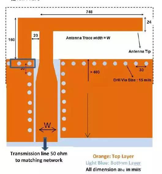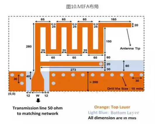 MIFA是一种普通的天线,被广泛地使用在各个人机接口设备(HID)中,因为它占用的PCB空间较小。因此赛普拉斯已设计出一种结实的MIFA天线,而它能在较小的波形系数中提供优越的性能。该天线的尺寸为7.2mm×11.1mm(相当于284密耳×437密耳),因此它很适合于各种HID的应用,例如无线鼠标、键盘或演示机等。图10显示的是所推荐的MIFA天线的详细布局,其中包含了双层PCB的顶层和底层。这种天线的迹线宽度均为20密耳。“W”的值是可改变的主要参数,它取决于PCB堆栈间隔,它表示RF走线(传输线)的宽度。