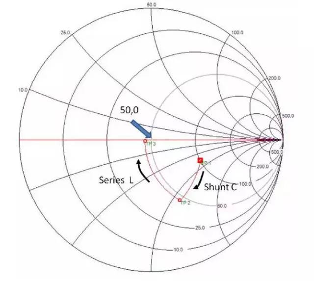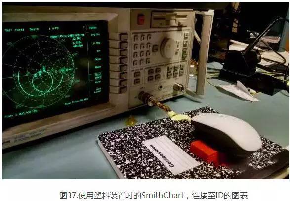 这样天线的电感会很大,所以要添加几个电容器以调整该电感。这是调整天线时遇到的典型问题。理论与实践间存在着明显的差别。用户可添加一个电容器,但请注意,如果添加某个电感,Smith图会向一定的方向移动。图35显示的是使用实际组件的最终Smith图表。