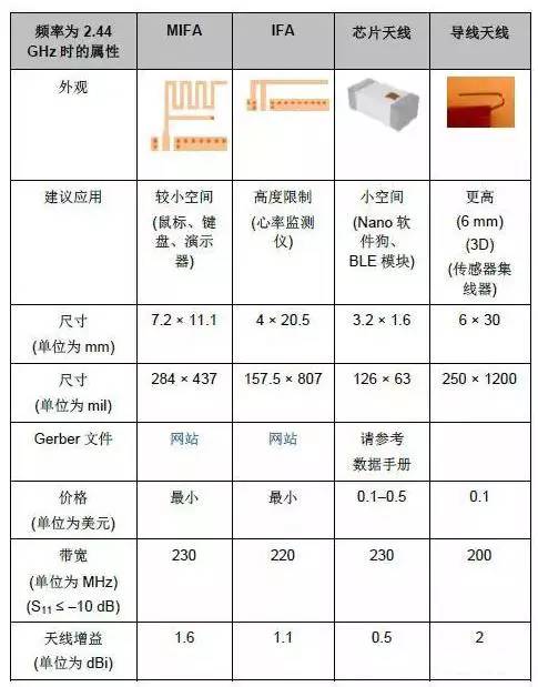 建议将MIFA天线使用在仅需极小的PCB空间的应用中,如无线鼠标、键盘、演示机等等。对于IFA天线,建议将其应用在要求天线一侧的尺寸远小于另一侧的尺寸的应用中,如心率监视器。大多数BLE应用中使用的是MIFA天线。下面各节将详细介绍每种天线的信息。