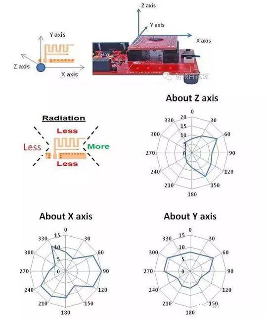 无方向性天线可以按与轴线相垂直的平面上所有方向进行等效发射。但大多数天线都达不到这个理想的性能。欲了解详细说明,请参看图9中所示的PCB天线的辐射图。