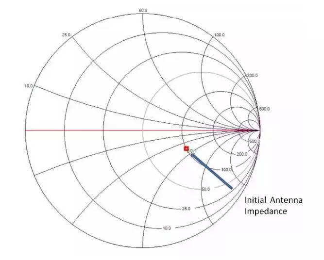 1.将一个8.2pF大小的电容与天线串联起来。在所需频带内,该电容的阻抗为0Ω。该阻抗便是天线阻抗。天线的阻抗等于(100.36–j34.82),如Smith图表中红色圆圈所示。
