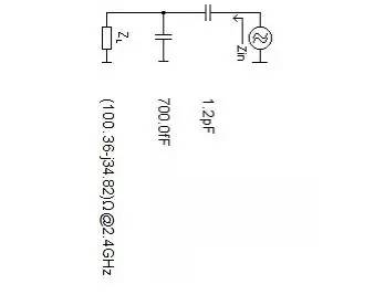 下面是该操作的简要说明。天线阻抗来自假定阻抗为0欧姆的8.2pF电容器。此外,该图也显示了频率为2.4Ghz时走线间电感的寄生电容。接地返回路径紧挨着该天线。但由于使用了匹配组件,接地返回路径将有额外的寄生电容。