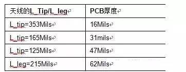 根据PCB的不同厚度,需要调整MIFA天线的长度,这样才能调整天线辐射的阻抗和频率选择。根据不同的电路板厚度,赛普拉斯提供了下面各天线长度。