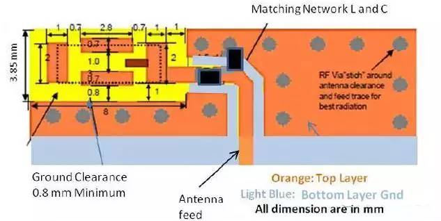 芯片天线的性能是由接地层决定。一般来说,它们需要更多的接地面积和更大的空间。如上图所示,对于2450AT42B100E的天线,最小的接地距离为0.8mm。该间距为2-3mm时,观察到的s11会更加明显。