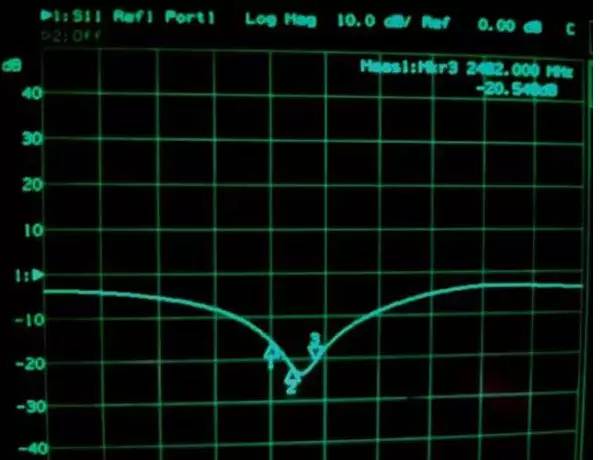 塑料外壳和附近移动的电池线缆可使天线完全失调,并且在2.402G到2.482G的优选频带内它的回波损耗会低于10db。因此,调试PCB空板后,需要使PCB保持在塑料外壳内,并使用鼠标重新检测调试。这样操作很复杂,尤其是还要将同轴电缆引出塑料装配外。