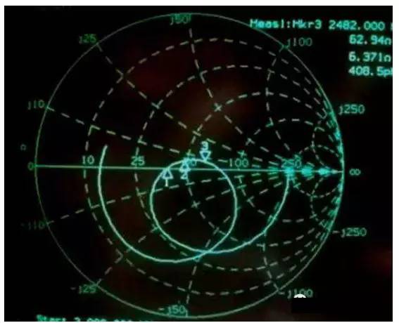 图中也显示了频率分别为2402MHz、2440MHz和2480MHz的标志1、2和3接近Smith图表上的(50,0)点。显示的是一个良好的匹配。
