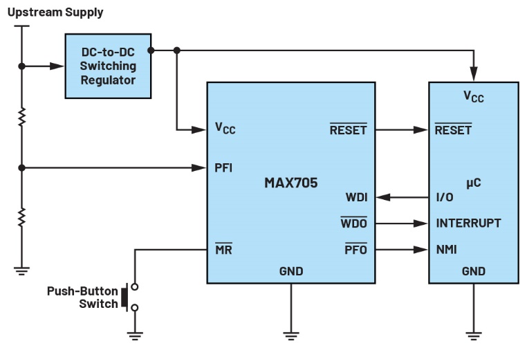 电源本身存在缺陷。直流电路中始终存在耦合的噪声伪影,这些伪影可能来自电源电路元件本身、其他电源的噪声以及系统产生的其他噪声。如果直流电源是开关电源(SMPS),这些问题可能会更严重。SMPS会产生与开关频率相关的开关纹波。在开关转换期间还会发生高频开关瞬变。这些开关转换操作是功率MOSFET的快速导通关断引起的。图1所示为应用电路,其中MAX705监控器用于监控开关稳压器的输出(即微控制器的电压源)是否存在任何问题。