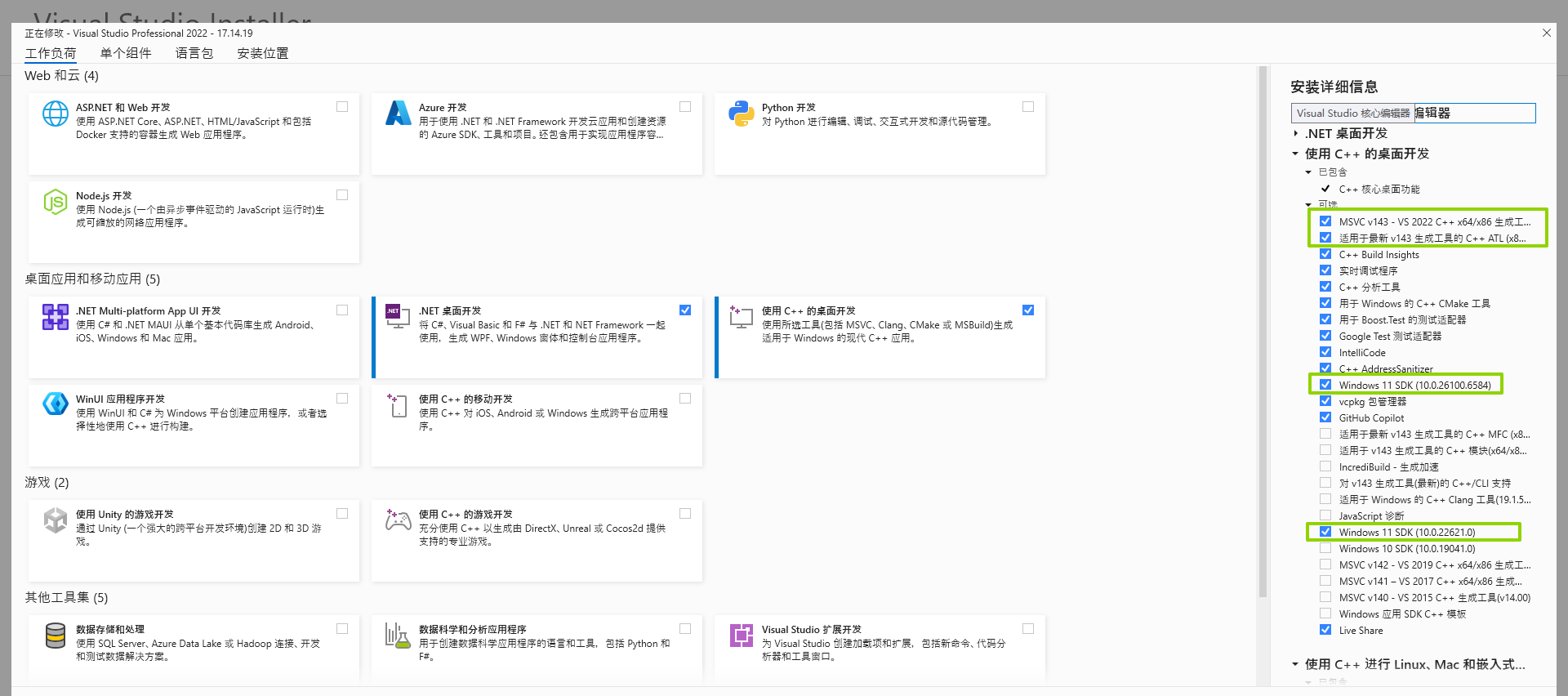 | 编译器 | Visual Studio 2022 (MSVC) | 推荐使用MSVC 2022,需安装“使用C++的桌面开发”工作负载,并确保包含最新的Windows SDK (如10.0.17763或更高)。 |