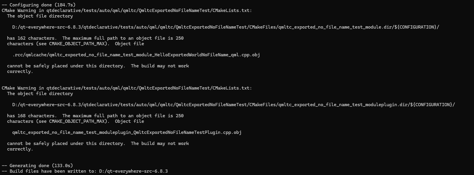 注意: 由于Windows路径的最大长度为被定义为260 个字符,路径过长或包含空格(如Program Files)可能导致编译失败,尤其是在编译Qt WebEngine时。错误警告如下: