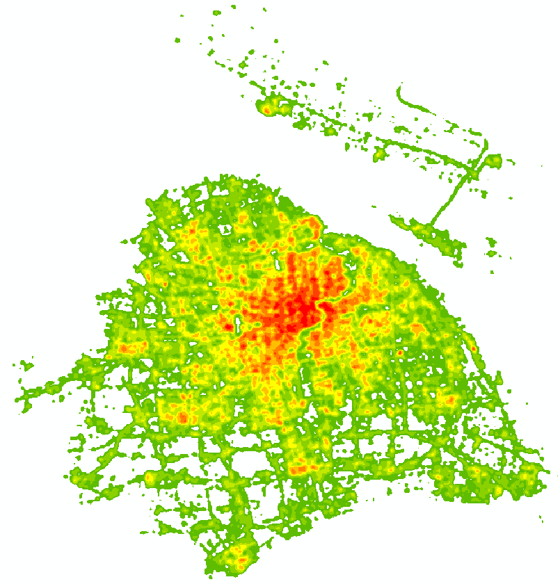 同理,利用工作日工作时段9:00-12:00,14:00-18:00的大数据训练识别,并剔除白天与夜间常住地在500m(交通出行定义的最短距离)范围以内的用户,将剩余用户近似作为就业岗位样本,得到的就业岗位地。