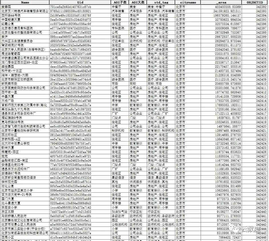 AOI字段:Uid、名称、AOI子类、AOI大类、城市名、面积。