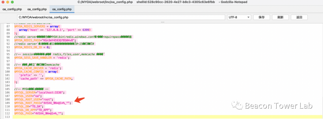 1) 找到通达OA的数据库配置文件webroot/inc/oa_config.php。通达OA的源码文件默认是加密的,但是配置文件是不加密的,所以可以直接打开查看,如图2.1所示。