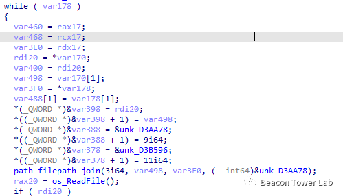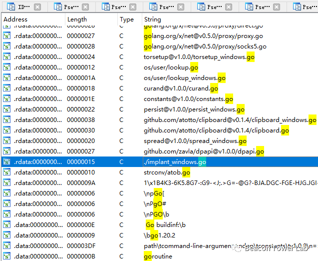该样本使用go语言编写,反编译后可以看到大量引用的go模块字符串,原始工程文件名为implant_windows.go,go版本为go1.20.2,如下图所示: