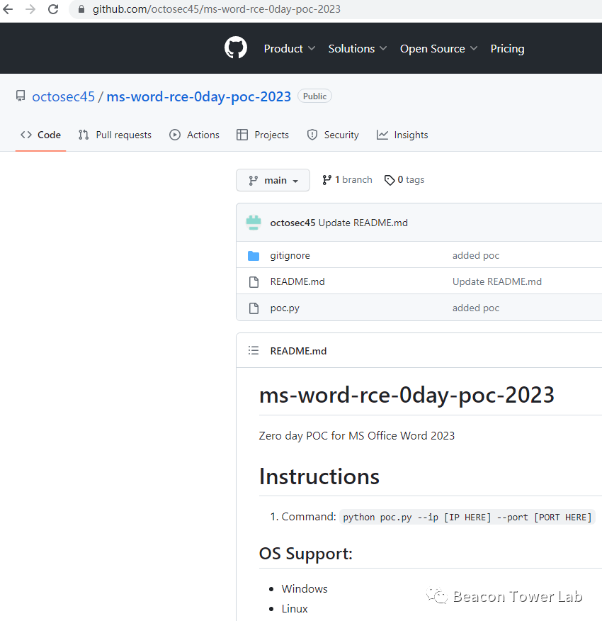 钓鱼地址:https://github.com/octosec45/ms-word-rce-0day-poc-2023(目前仍存活)