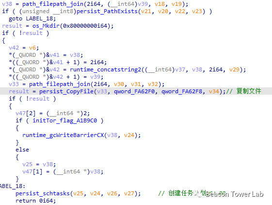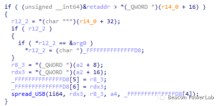 此外,代码中还包含名为spread_USB的函数,实现USB传播木马的功能,但是还有复杂的逻辑判断后才运行该功能,笔者暂时没有找到启用该功能的条件。如下图所示: