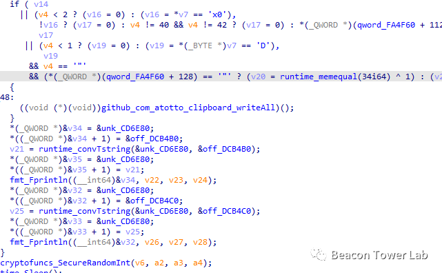 还包含名为spread_Cryptohijack的函数,实现替换剪贴板中的数字货币BTC地址,但是也有复杂的逻辑判断后才运行该功能,笔者暂时没有找到启用该功能的条件。如下图所示: