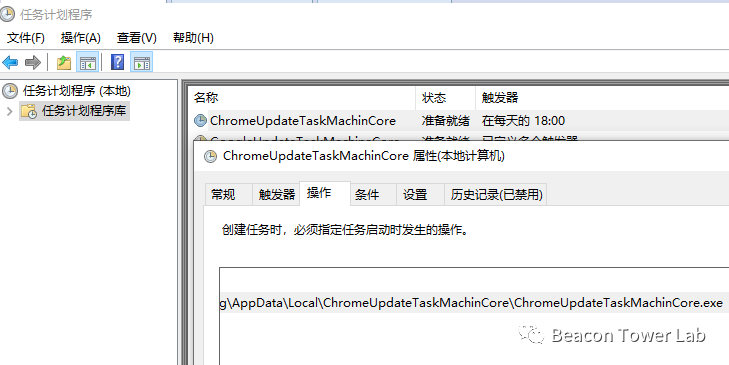 %ProgramFiles%和%LOCALAPPDATA%路径下是否特定文件夹名,文件夹名包括:WindowsUpdateTaskUAACore、ChromeUpdateTaskMachinCore、ChromeUpdateTaskMachinCore等。如果不存在,则复制自身文件到其中一个文件夹下,再创建任务计划,每天18:00启动木马程序,如下图所示: