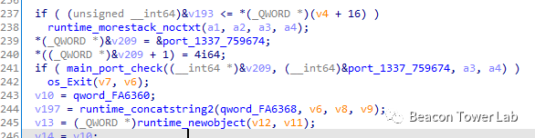 样本运行后,将执行一个名为port_check的函数,该函数主要检测本地端口1337是否开启,如果没有开启,则继续往下执行;如果开启,则退出程序。该功能可以实现只运行一个实例,如下图所示:
