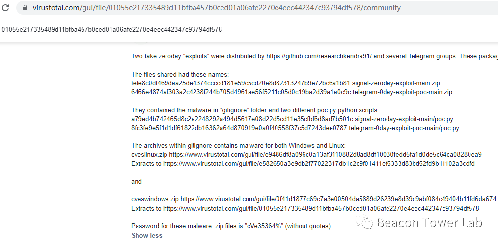 近日,烽火台实验室监测到多起针对安全人员的钓鱼攻击。其中一例利用MS Office Word 0DAY进行钓鱼,在github.com和Telegram群组中公开0DAY利用程序,其中并没有包含真正的利用程序,但是却捆绑了木马。运行后下载和执行木马程序,木马使用TOR匿名网络连接黑客控制服务器,接受黑客控制。平时下载运行网络上的漏洞利用程序时要多加小心,避免成为黑客的“肉鸡”。