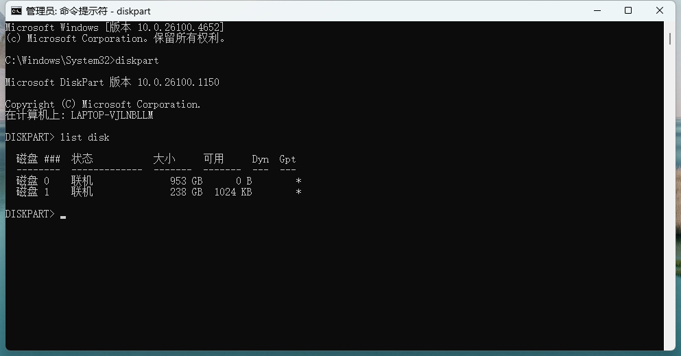 3.列出所有磁盘 : 输入list disk 点击回车(这是已经设置好的)
