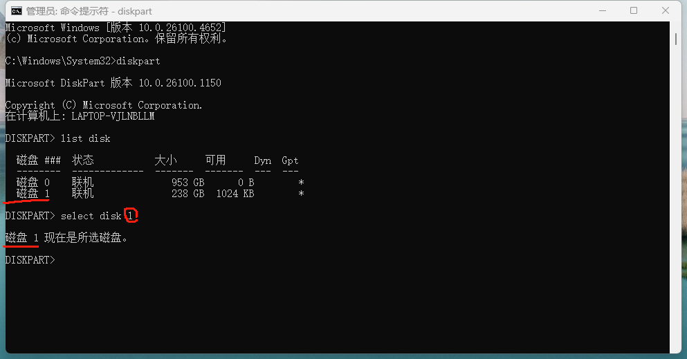 4.选择你需要变更的盘: 输入 select disk 1 确认 (1为你自己需要变更的磁盘号)