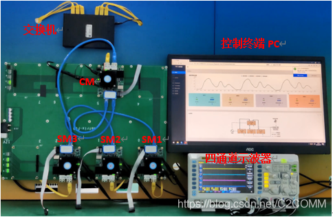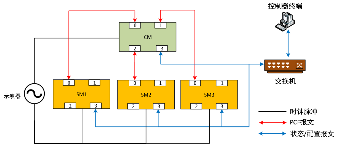 4台AS6802时间同步节点组成一个同步域,包含1个压缩主(CM)和3个同步主(SM1~SM3)。示波器的四个通道分别连接到同步节点板卡上的测试点,探测个节点的同步脉冲信号,并实时计算同步脉冲信号间的误差。所有同步节点与控制终端PC通过一个普通交换机组成带外配置管理网络,实现控制终端PC对同步节点的配置和状态监控。所有同步节点在运行过程中采集状态信息,并实时发送给控制终端,控制终端可通过回溯这些状态报文来监控分析节点的状态变化,辅助调试与测试。