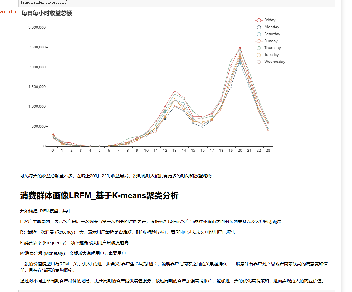 将按小时聚合的数据按天切分,就像把一长串时间“项链”拆成一个个“时间珠子”(每天的24小时数据),深入分析每天不同时段的收益波动。结合 pyecharts 绘制折线图,展示每日每小时收益总额,直观发现:每天收益总额相近,晚上20时 - 22时是“收益高峰”,说明此时人们有更多时间和购物意愿,企业可针对性推出限时优惠,抓住消费时机: