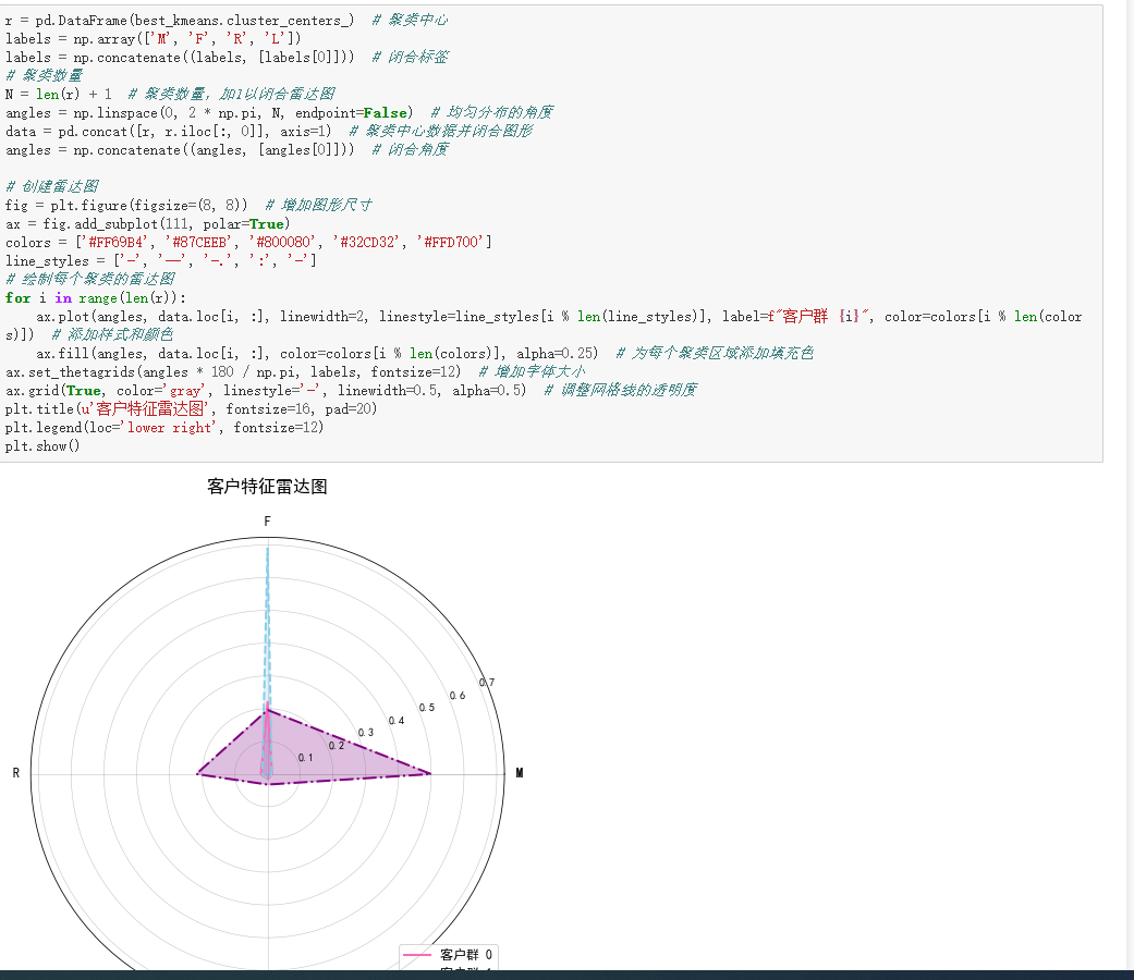 将聚类标签与原始数据合并,得到带聚类ID的客户数据。分析不同聚类中心的LRFM值,绘制客户特征雷达图: