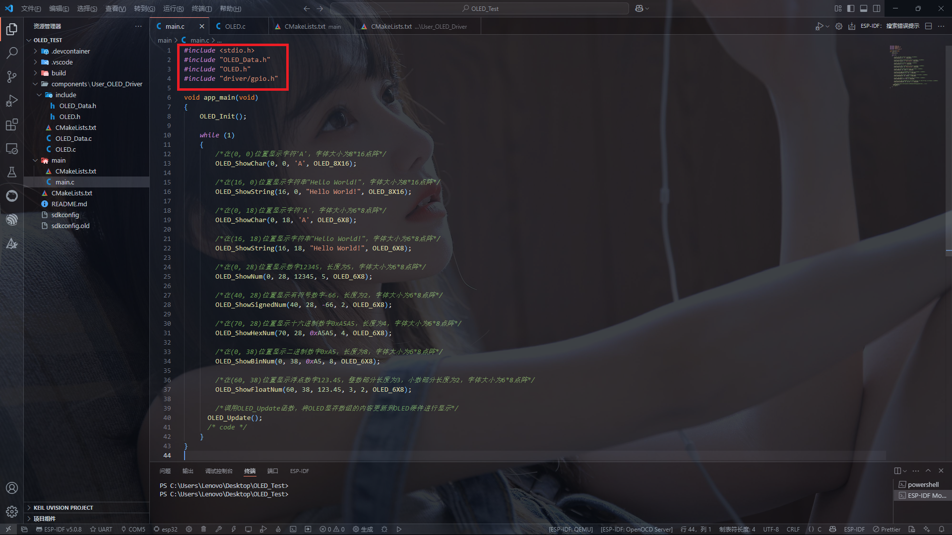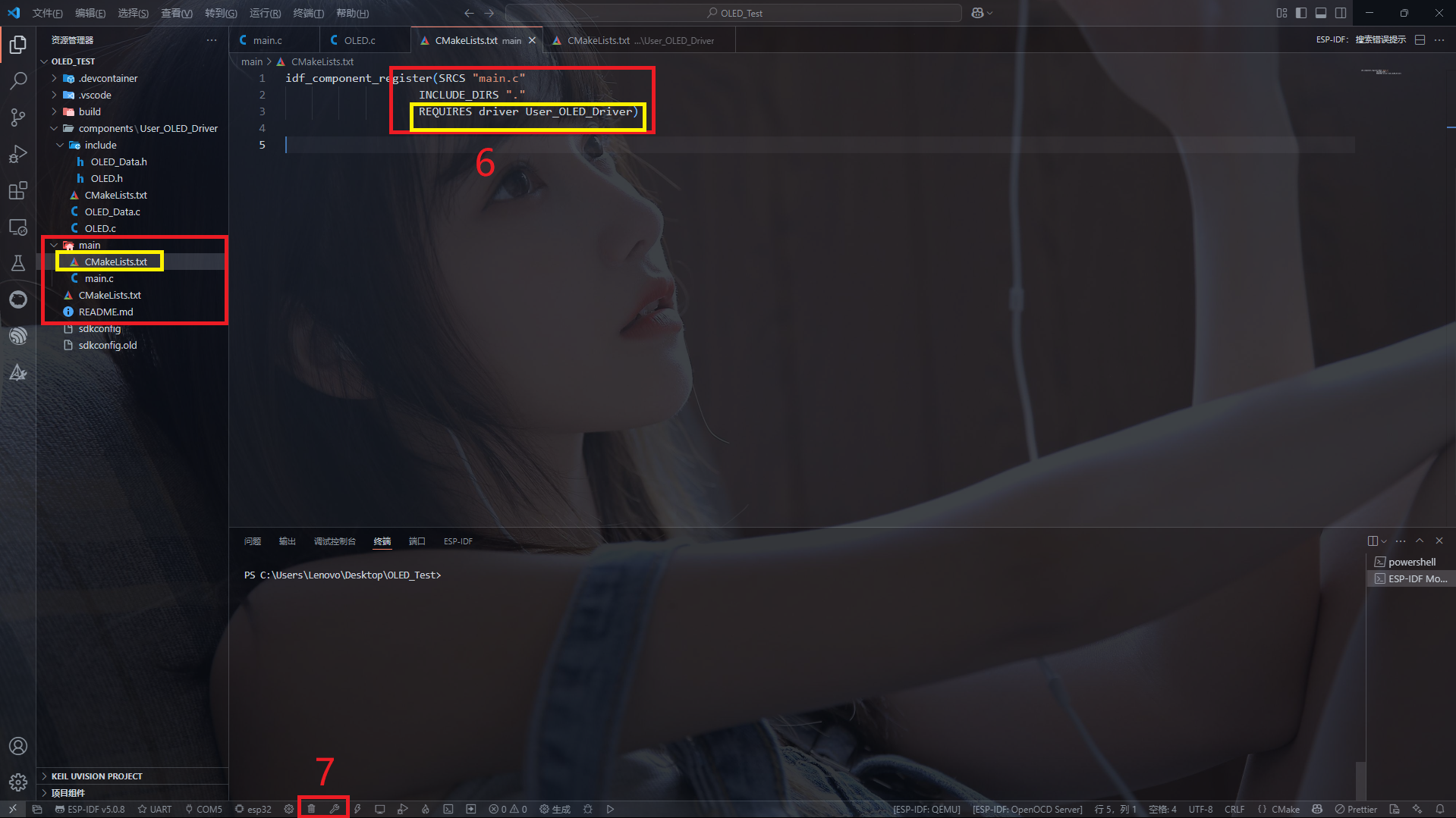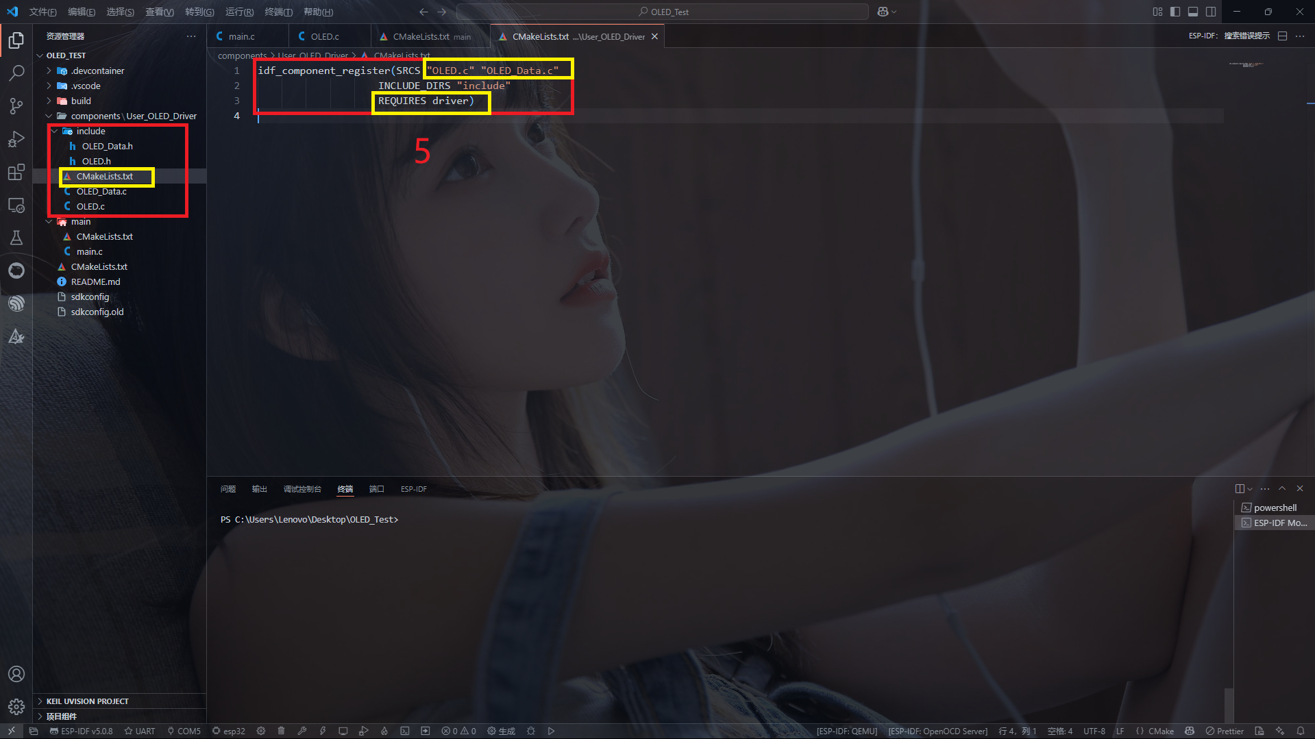 (5)、点击User_OLED_Driver组件中的CMakeLists.txt文件进行编辑,首先 将"OLED_Data.c"和"OLED.c"添加至SRCS后,然后将REQUIRES driver添加INCLUDE_DIRS "include"后。