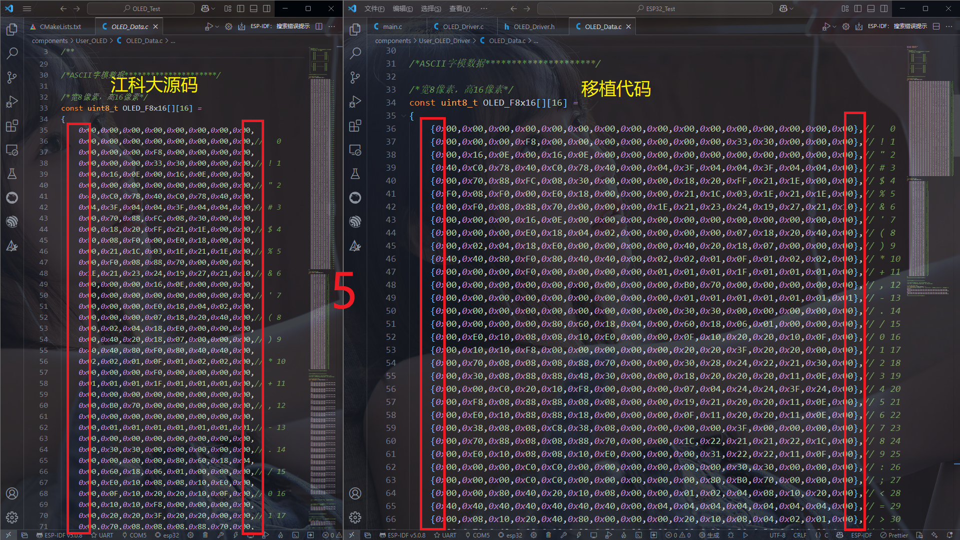 由于编译器不同,ESP-IDF会对源码中的显示数组格式报错,按图修改格式格式即可,按住Shift+Alt键即可按列选中快速修改。