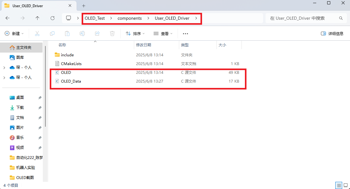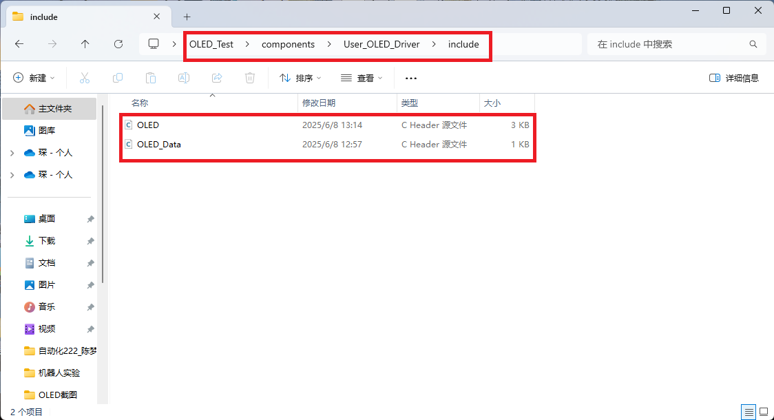 创建组建完成后,江科大OLED驱动文件放入组件中。将OLED.C文件和OLED_Data.C文件放入User_OLED_Driver文件夹目录下,将OLED.H文件和OLED_Data.H文件放入include文件见目录下,如下图所示。