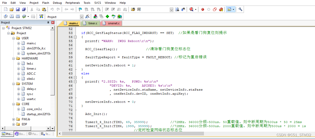 程序部分展示:/******************************************************************************平台下发命令解析******************************************************************************/if(oneNetInfo.netWork && NET_DEVICE_Get_DataMode() == DEVICE_DATA_MODE) //当有网络 且 在命令接收模式时{dataPtr = NET_DEVICE_GetIPD(0); //不等待,获取平台下发的数据if(dataPtr != NULL) //如果数据指针不为空,则代表收到了数据{OneNet_App(dataPtr); //集中处理}}/******************************************************************************错误处理******************************************************************************/if(faultType != FAULT_NONE) //如果错误标志被设置{printf( "WARN: Fault Process\r\n");Fault_Process(); //进入错误处理函数}/******************************************************************************数据反馈******************************************************************************/if(oneNetInfo.sendData){oneNetInfo.sendData = OneNet_SendData(kTypeSimpleJsonWithoutTime, dataStreamLen);}}else{/******************************************************************************初始化网络设备、接入平台******************************************************************************/if(!oneNetInfo.netWork && (checkInfo.NET_DEVICE_OK == DEV_OK)) //当没有网络 且 网络模块检测到时{//LCD_ShowString(30,20,220,24,24,"Connectting... ");NET_DEVICE_Set_DataMode(DEVICE_CMD_MODE); //设置为命令收发模式if(!NET_DEVICE_Init()) //初始化网络设备,能连入网络{OneNet_DevLink(oneNetInfo.devID, oneNetInfo.apiKey); //接入平台if(oneNetInfo.netWork){Led0_Set(GPIO_ON); //亮灯提示//LCD_ShowString(30,20,220,24,24,"Connectted OK ");runTime = timInfo.timer6Out; //更新时间}else{//LCD_ShowString(30,20,220,24,24,"Not Connected ");}}}/******************************************************************************网络设备检测******************************************************************************/if(checkInfo.NET_DEVICE_OK == DEV_ERR) //当网络设备未做检测{NET_DEVICE_Set_DataMode(DEVICE_CMD_MODE); //设置为命令收发模式if(timerCount >= NET_TIME) //如果网络连接超时{Led0_Set(GPIO_OFF); //灭灯代表掉线printf( "Tips: Timer Check Err\r\n");NET_DEVICE_Reset(); //复位网络设备timerCount = 0; //清零连接超时计数faultType = FAULT_NONE; //清除错误标志}if(!NET_DEVICE_SendCmd("AT\r\n", "OK")) //网络设备检测{printf( "NET Device :Ok\r\n");checkInfo.NET_DEVICE_OK = DEV_OK; //检测到网络设备,标记NET_DEVICE_Set_DataMode(DEVICE_DATA_MODE); //设置为数据收发模式}elseprintf( "NET Device :Error\r\n");}}}}