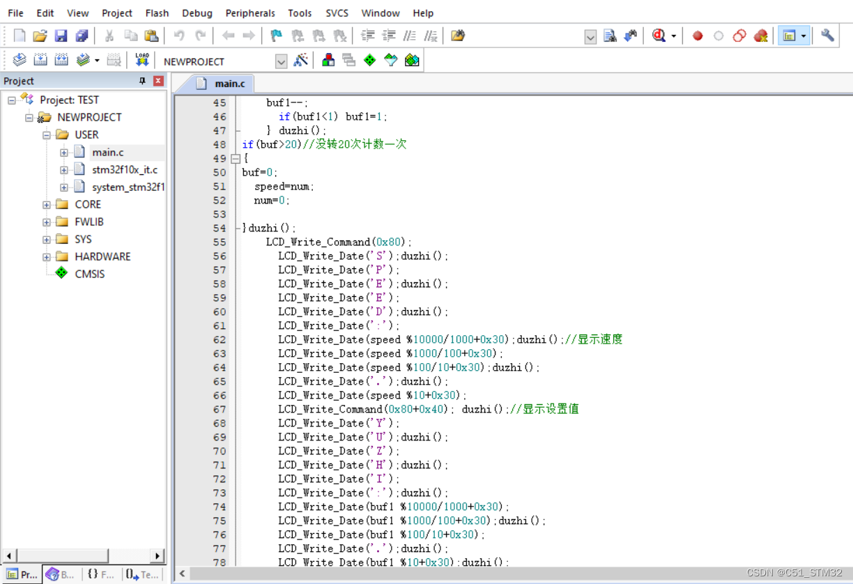 该系统基于STM32单片机,使用编码器测速,通过LCD1602显示并设置速度报警值。当电机转速超过设定值时,蜂鸣器报警。程序有中文注释,包含系统时钟初始化、延时函数、LCD及键盘接口等实现。