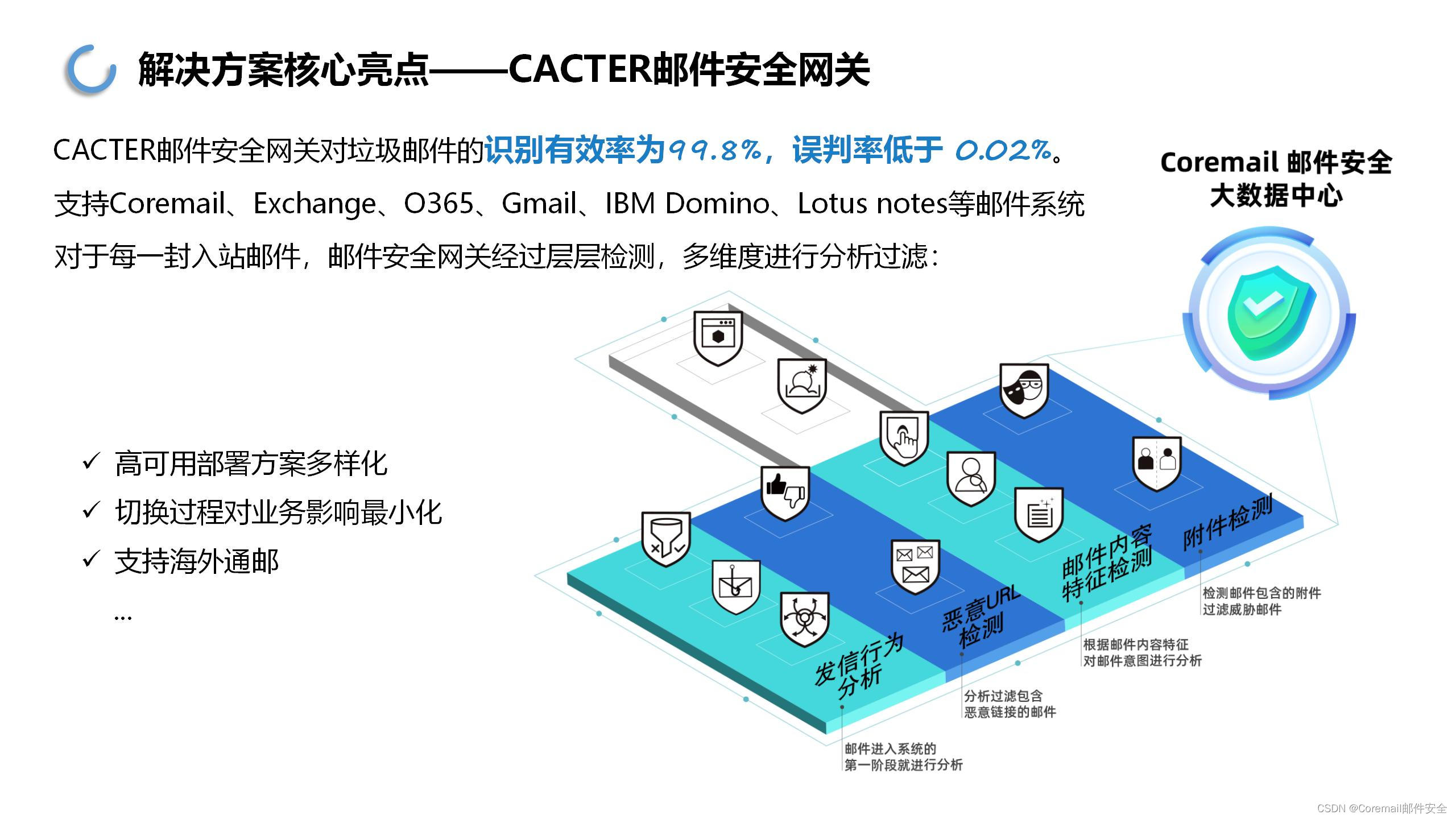 CACTER邮件安全云网关依赖Coremail邮件安全大数据中心,通过机器学习算法模型+专家审核规则双重策略,可快速准确识别垃圾邮件,具有不可比拟的邮件反垃圾大数据技术优势——垃圾邮件识别率高达99.8%。