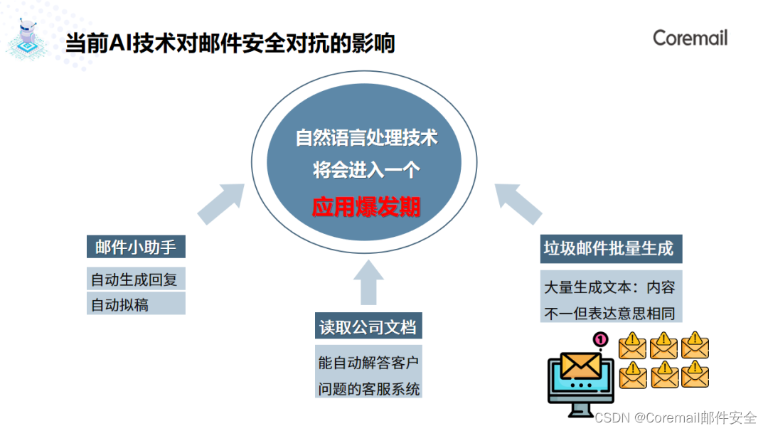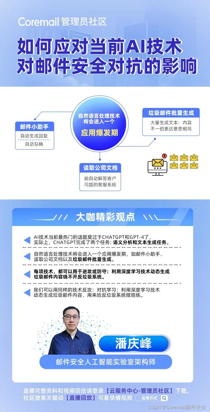 3月23日,Coremail邮件安全人工智能实验室首席架构师潘庆峰(下文简称“大P”)在直播间进行了深度分享,作为中国电子邮件元老级技术专家,20年以来长期深耕于智能算法在邮件安全领域的应用实践,从目前大火的AI热潮中,他看到了哪些挑战与机会呢?