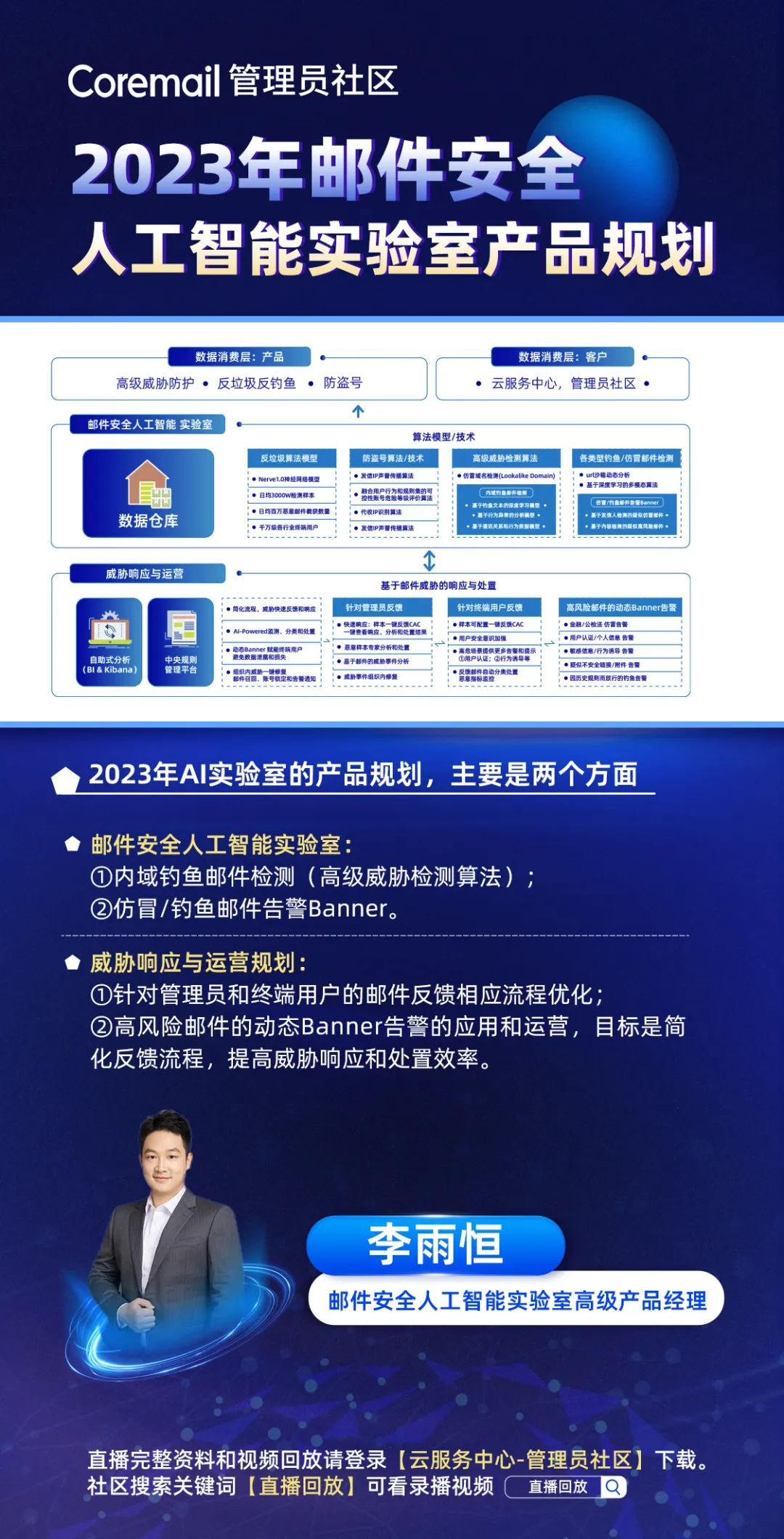 3月23日,Coremail邮件安全人工智能实验室首席架构师潘庆峰(下文简称“大P”)在直播间为观众朋友们介绍了Coremail AI技术发展历程,并展示了CAC邮件安全大数据中心与应用产品的闭环架构,也欢迎志同道合的朋友们与我们共同讨论分享。