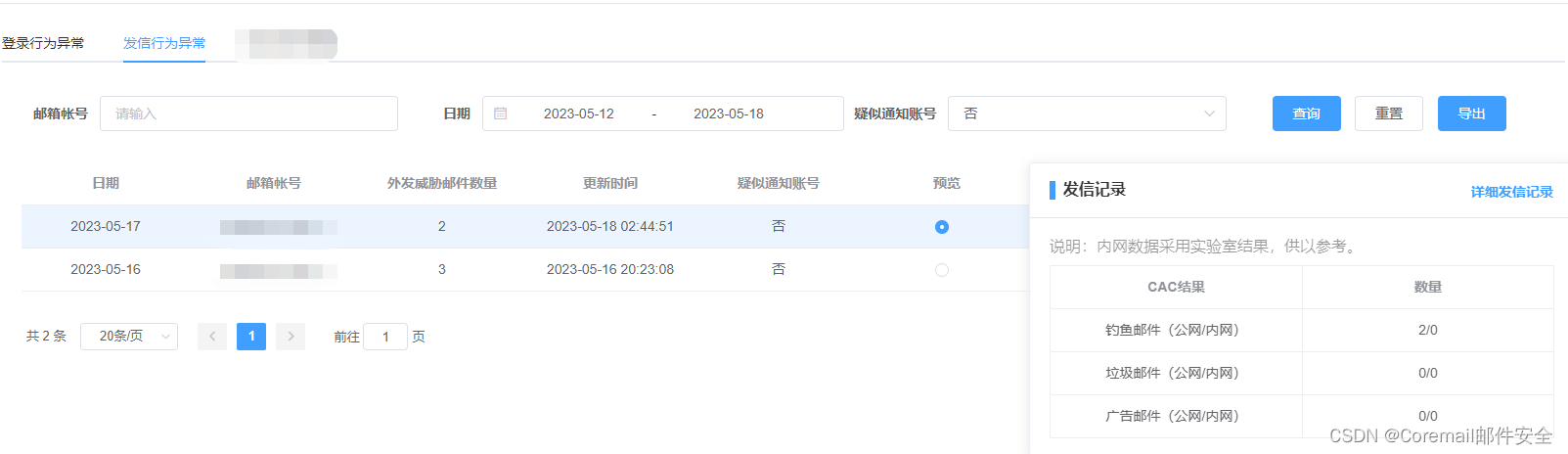 ——发信行为异常:使用CAC检查结果,结合IP声誉等信息,综合研判获得“发信行为异常”情报,助力管理员更快速分析该账号是否处于被盗状态,把控本域内垃圾邮件的外发状态,及时删除邮件并通知用户修改密码。