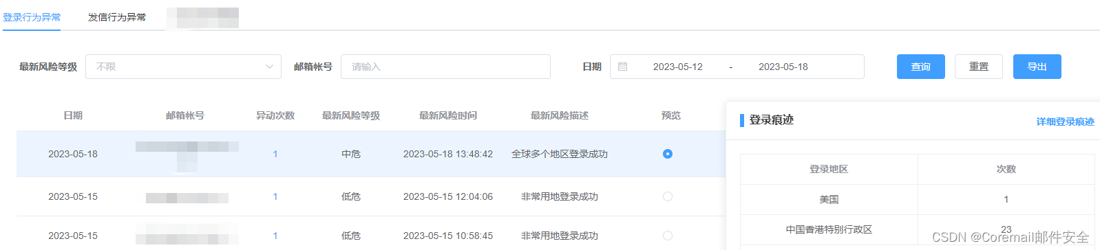 ——登录行为异常:根据用户邮箱账号的登录习惯,快速识别异常的登录行为,识别疑似被盗账号,根据账号的风险行为等级区分高、中、低危,建议客户主要关注【高、中危账号】,通过风险描述研判账号是否已经被盗取,及时处理。