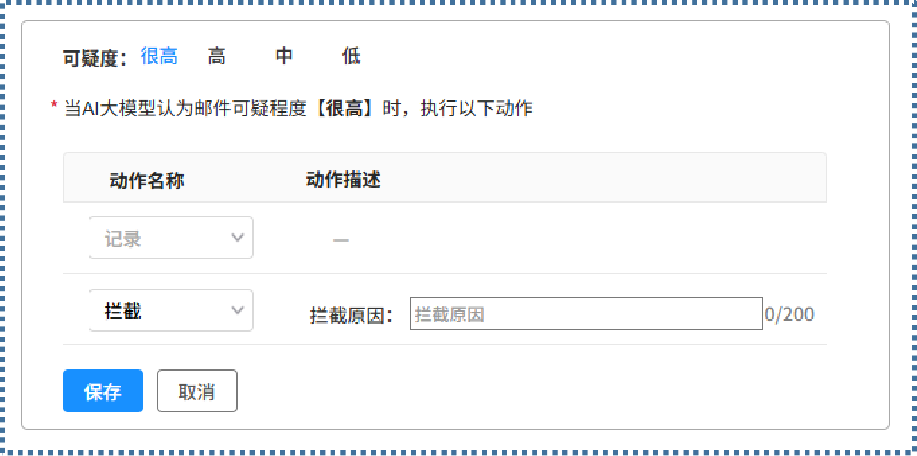 管理员可根据业务需求,自由选择让大模型分析范围(外发邮件/域内邮件);针对大模型分析失效的极端情况,还能预设“人工审批、放行、拦截”等保护性动作,形成安全兜底。同时,可按“邮件可疑度”匹配管控措施,比如大模型判定“可疑度很高”时自动触发拦截,兼顾安全与办公效率。