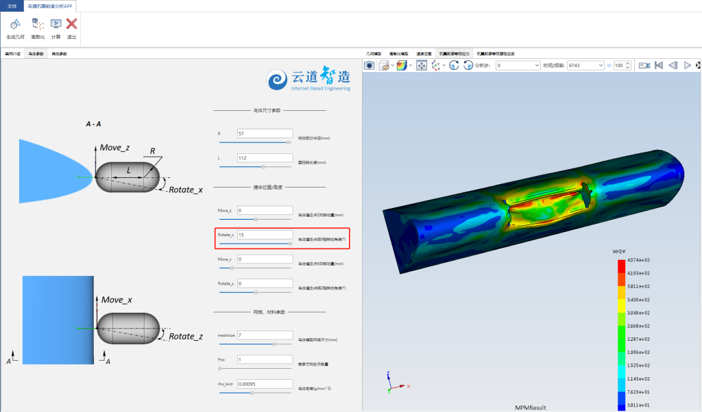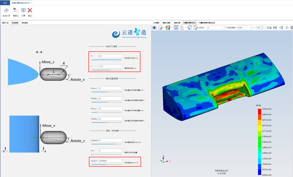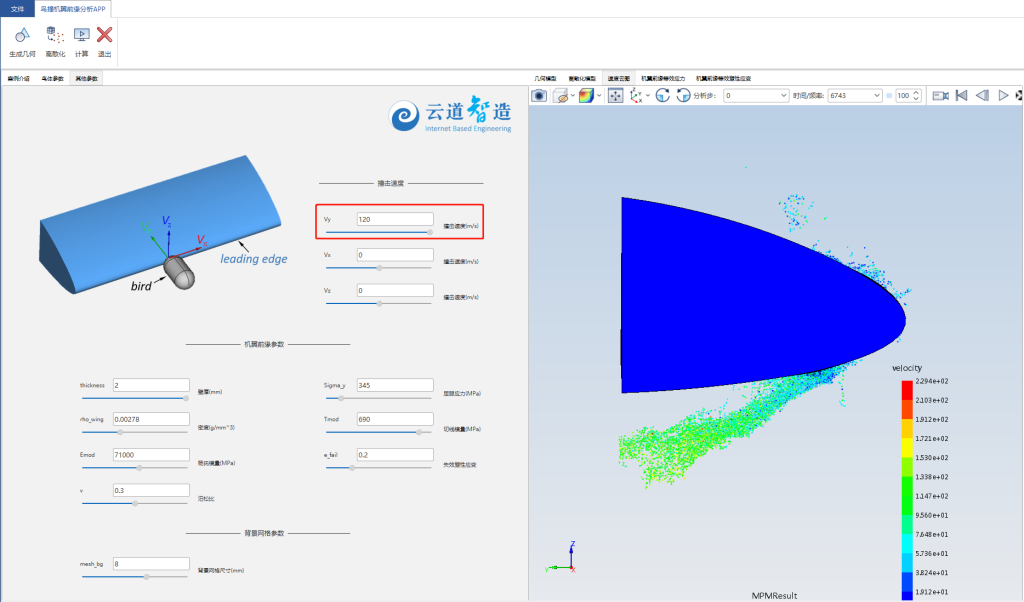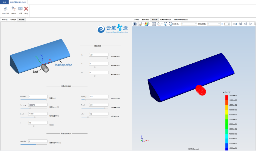 相比于昂贵的模型试验与复杂的仿真流程,仿真APP可显著降低用户的学习难度和使用成本,使用户迅速获得不同工况条件下的仿真结果。此外,仿真APP还能通过云图、动画等可视化手段,直观展示鸟撞事件对飞机结构造成的具体影响,极大提升教学、研发的效果与效率。