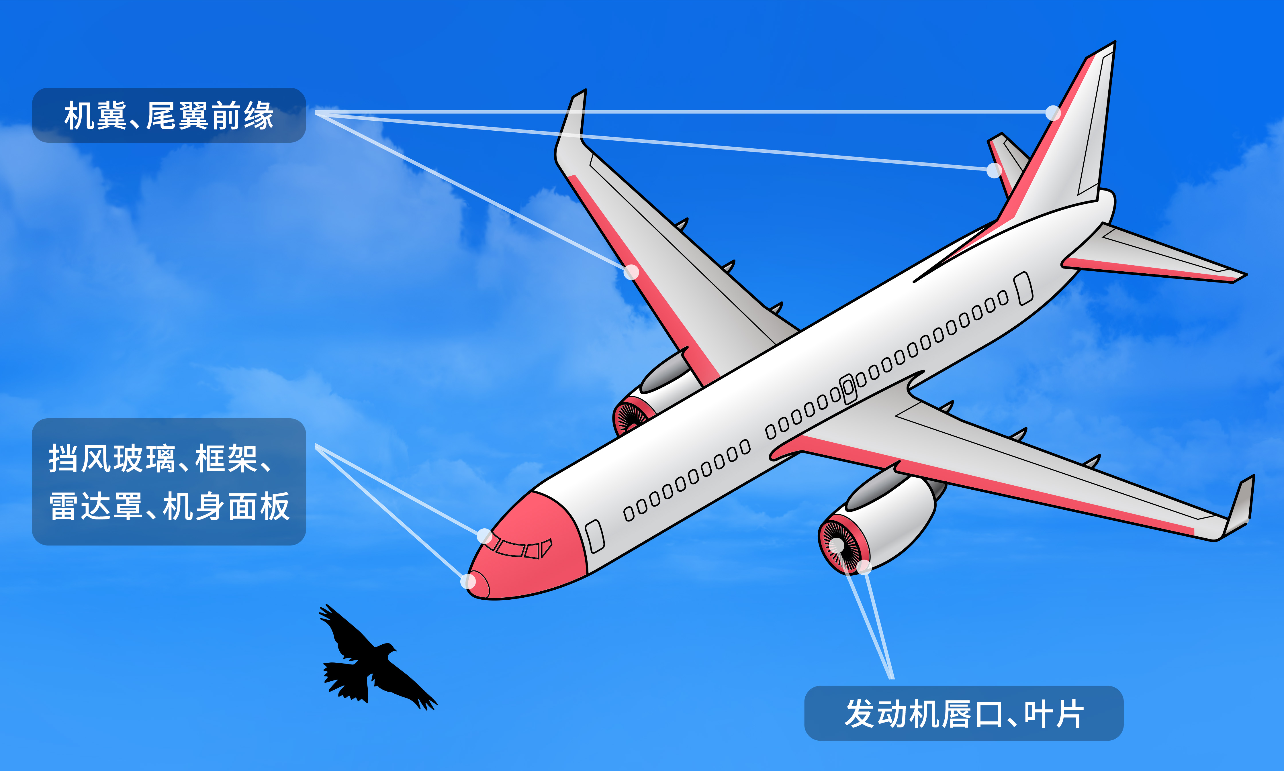 鸟撞机翼:机翼是飞机产生升力的关键部件。鸟撞可能会导致机翼前缘的蒙皮出现破损、撕裂,或损坏襟翼的传动装置,进而影响整机的空气动力学性能。