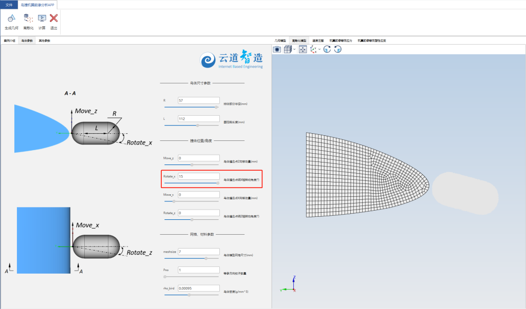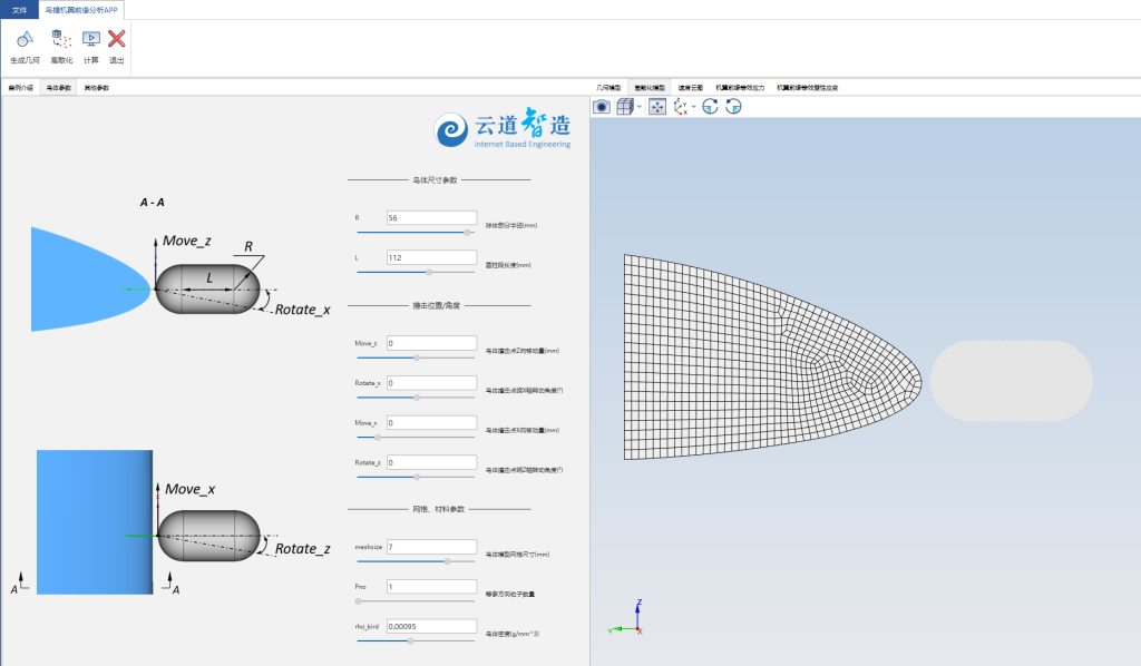为解决仿真建模过程复杂、专业性要求高的困难,云道智造自主研发的伏图(Simdroid)平台还提供了仿真APP开发功能。在平台中完成鸟撞尾翼前缘分析模型创建后,开发者可以将仿真模型封装为仿真APP。仿真APP开发器内置输入框、按钮、视图窗口等十余种界面控件,开发者无需掌握编程语言,通过简单的鼠标拖拽行为即可便捷地封装仿真模型与仿真流程,生成轻量化、可复用的仿真APP。在APP中调整参数,点击命令按钮(生成几何、离散化),即可自动生成鸟体和机翼前缘的模型,用于撞击过程的仿真分析。