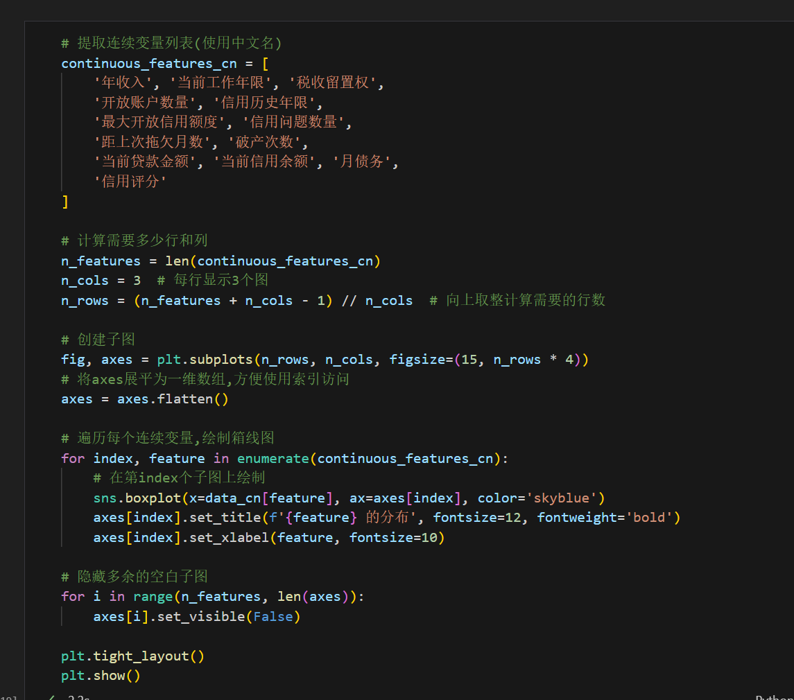 for index, feature in enumerate(continuous_features_cn): sns.boxplot(..., ax=axes[index]) # 使用索引定位子图 -
