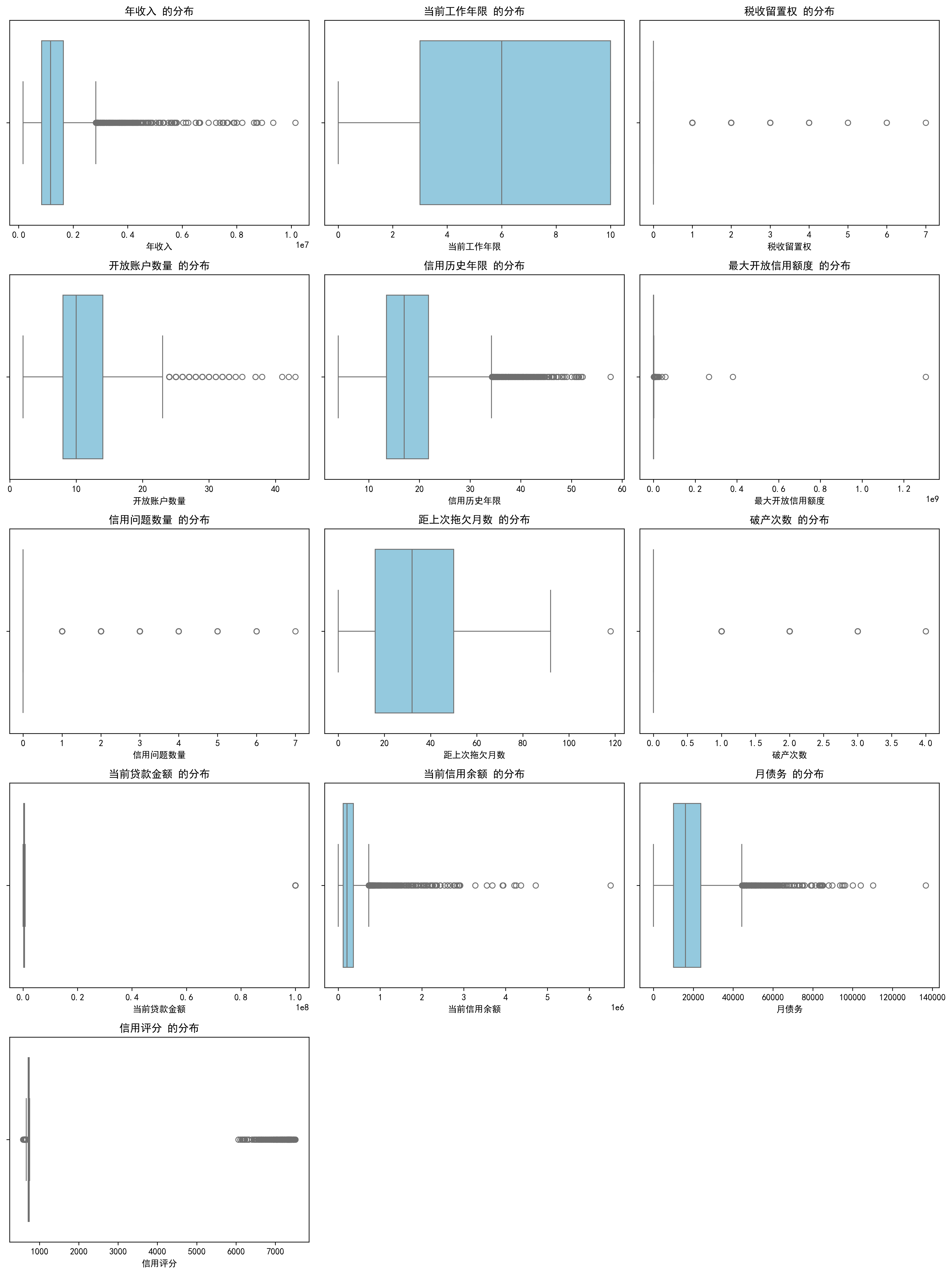 现在我们使用子图来批量绘制所有连续变量的箱线图,观察每个特征的分布特征。