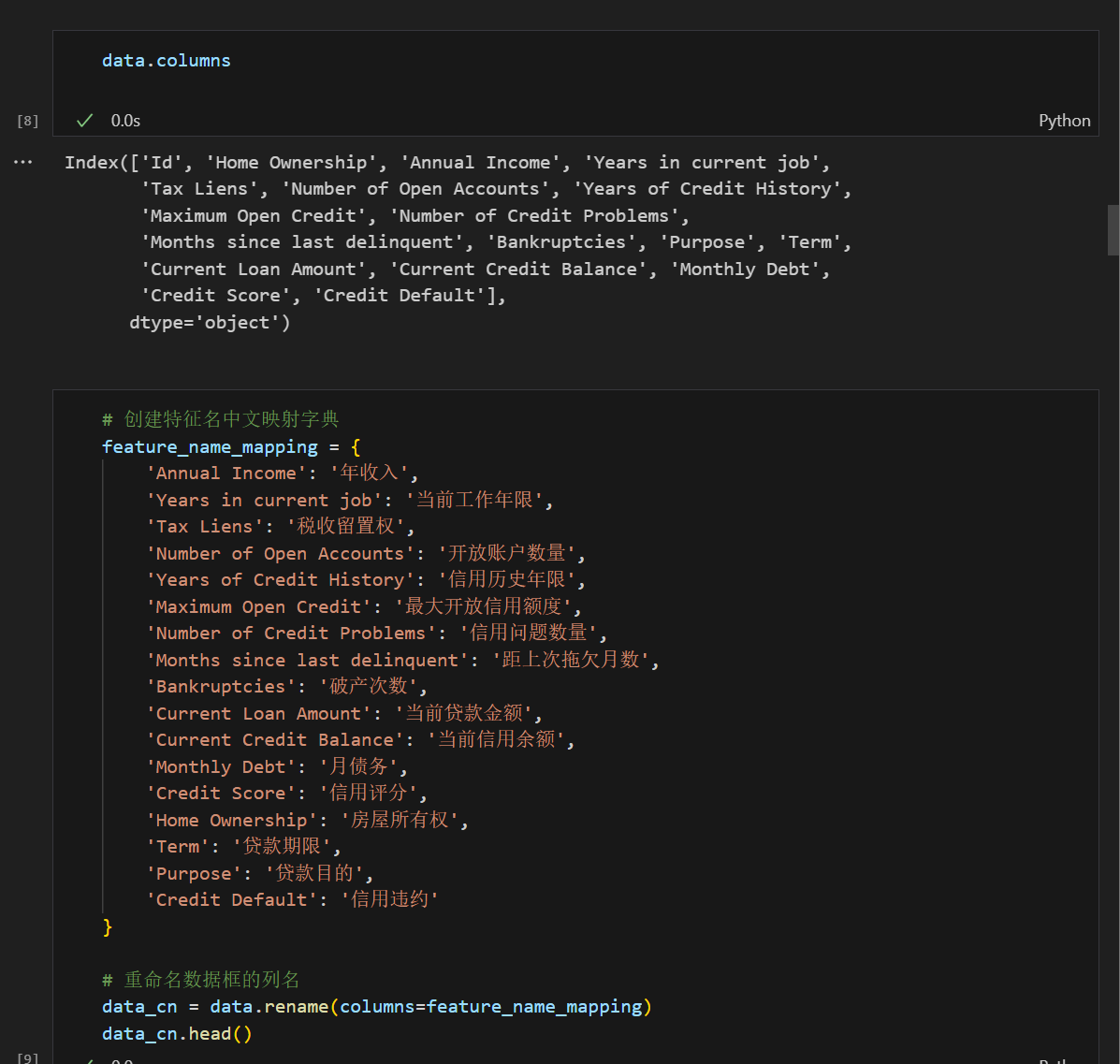 为了更好地理解数据,我们将英文特征名映射为中文特征名。
